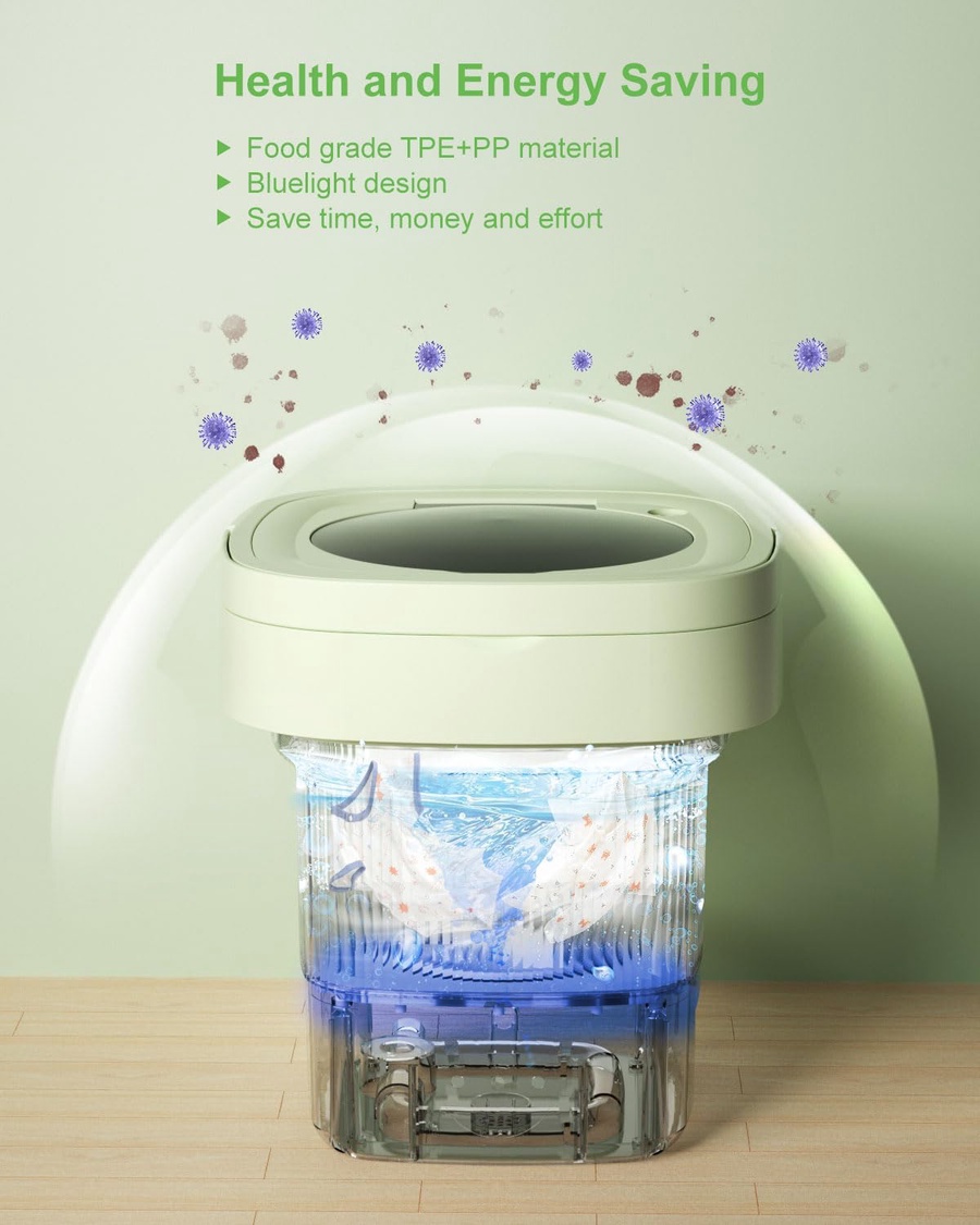 صديقة للبيئه.. حيث توفر في استهلاك الماء و الكهرباء.. و تشمل كوب شفط قوي.. لذلك لا داعي للقلق من الاهتزاز.. ✅التصميم: له وظيفه تنظيف اوتوماتيكيه بالكامل تجعل ملابسك نظيفة للغايه بدون بقايا او مهيجات.. مناسبه للاشخاص الذين لا يستطيعون يستخدمون آلات كبيرة..السعة: ٢ كجم (حوالي ٤.٤ رطل) سعة الحوض ٢.٨ لتر الأبعاد: ٢٠.٥ × ٢٠.٥ × ٢٦ سم الوزن: ١.٤٥ كجم الطاقة: ٣٦ واط الجهد الكهربائي: ١١٠-٢٢٠ فولت التردد: ٥٠/٦٠ هرتز سرعة الدوران القصوى ١٥٠ دورة 🧺الغساله المحموله حيث لا يزيد سمكها عن3.6 انش فقط.. و بالتالي لا تحتاج لمساحة كبيرة لتخزينها.. ✅ و الضغط على زر التشغيل الغساله موفرة للطاقة الحل المثالي لغسيل الملابس الحساسة